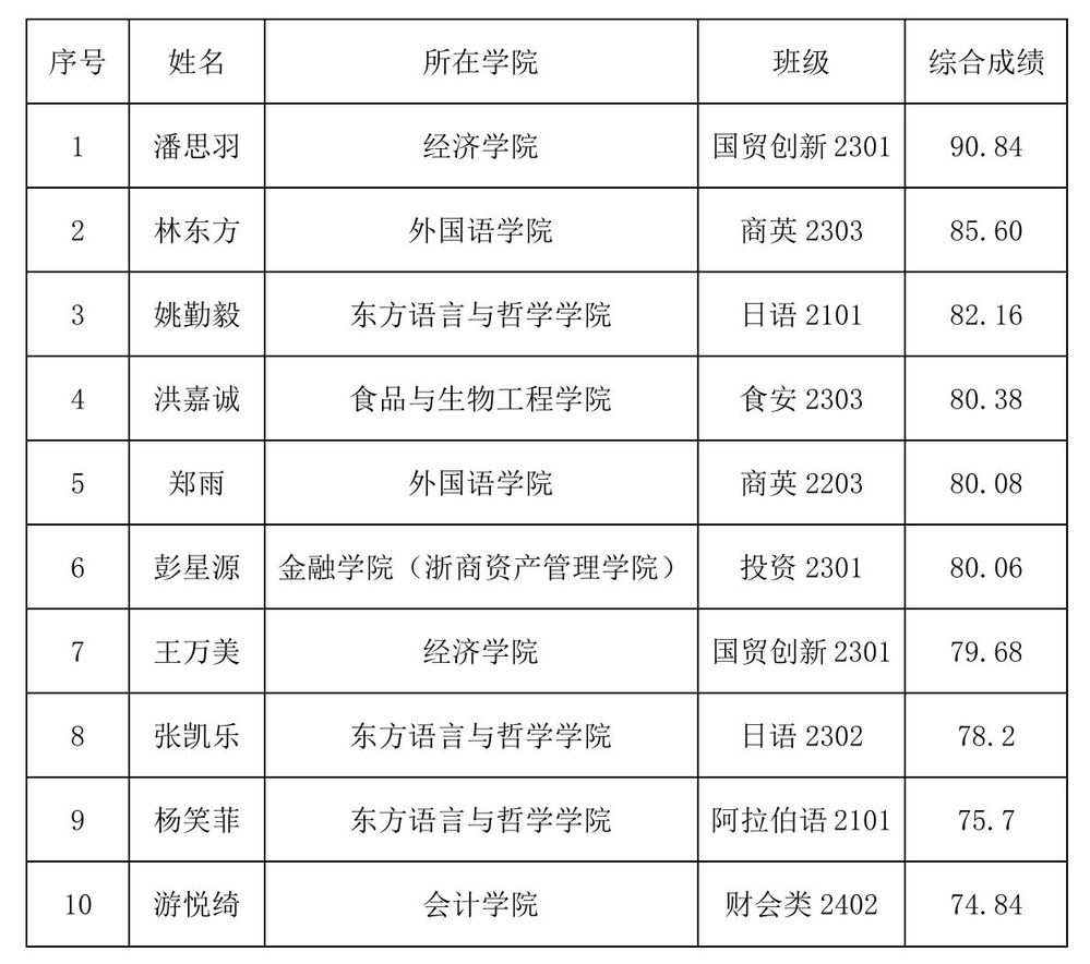 经学生本人申请,学生所在学院审查,足交 组织笔面试(综合成绩计算方法为:笔试成绩占70%,面试成绩占30% ),拟选派潘思羽等10名学生2025年寒假赴日本鹿儿岛大学参加短期研修,现将名单公示如下: